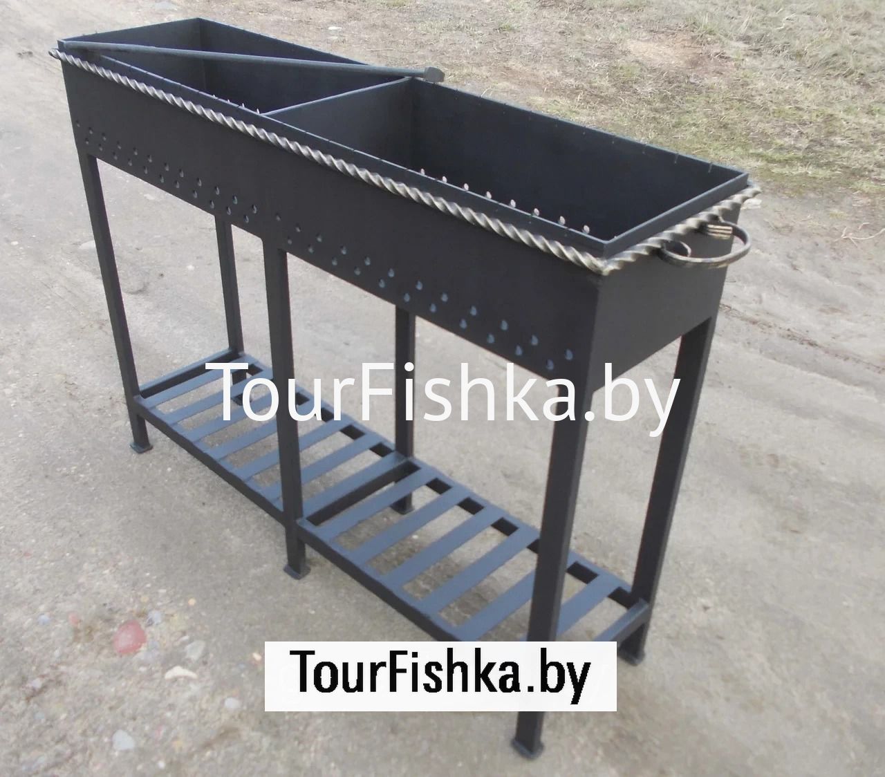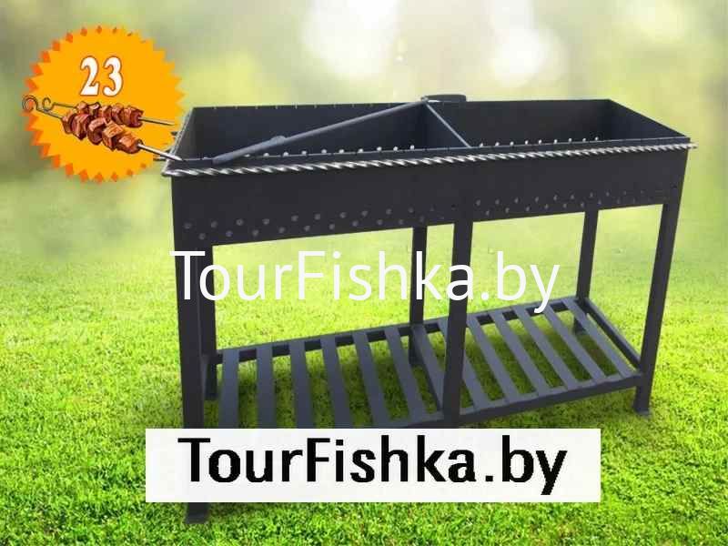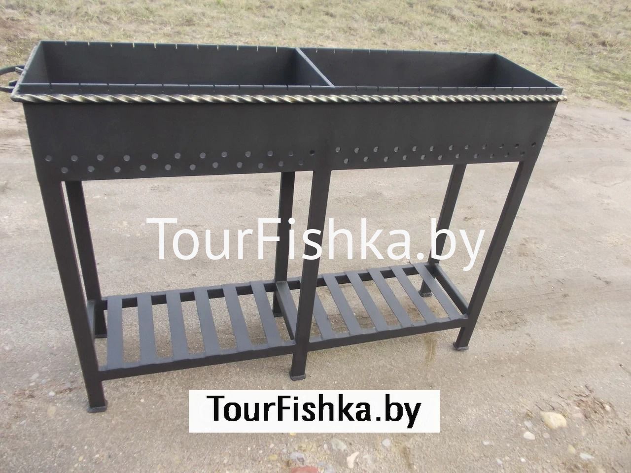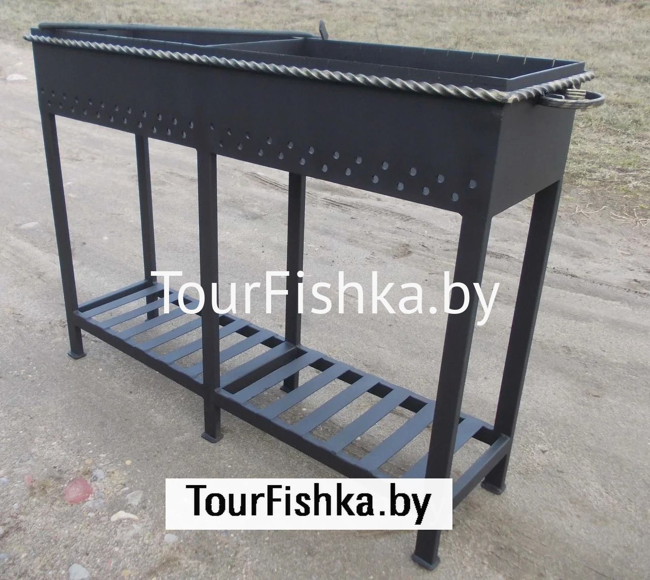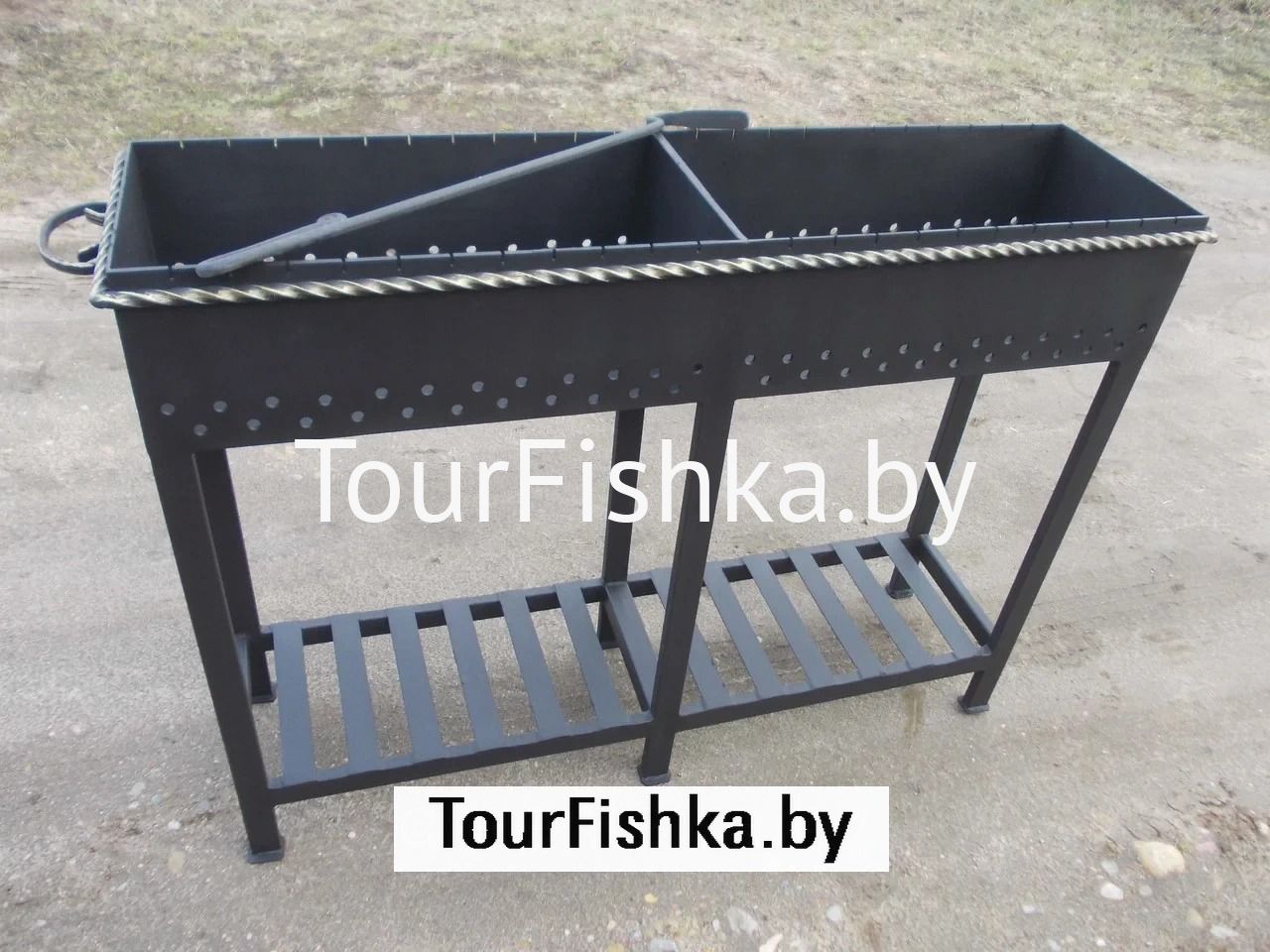 Кованый двухсекционный мангал - это вместительный и удобный мангал для большой семьи с дровницей - нижняя полка для дров, угля. Длина мангала - 120 см. Разделен на две части перегородкой. Одновременно на таком мангале могут жариться до 23 шампуров с шашлыком! Наличие перегородки, разделяющей мангал на две части, позволяет готовить в двух частях мангала разные продукты, не смешивая их запахи и вкусы. Или же при приготовлении использовать лишь половину мангала, если продуктов не много.