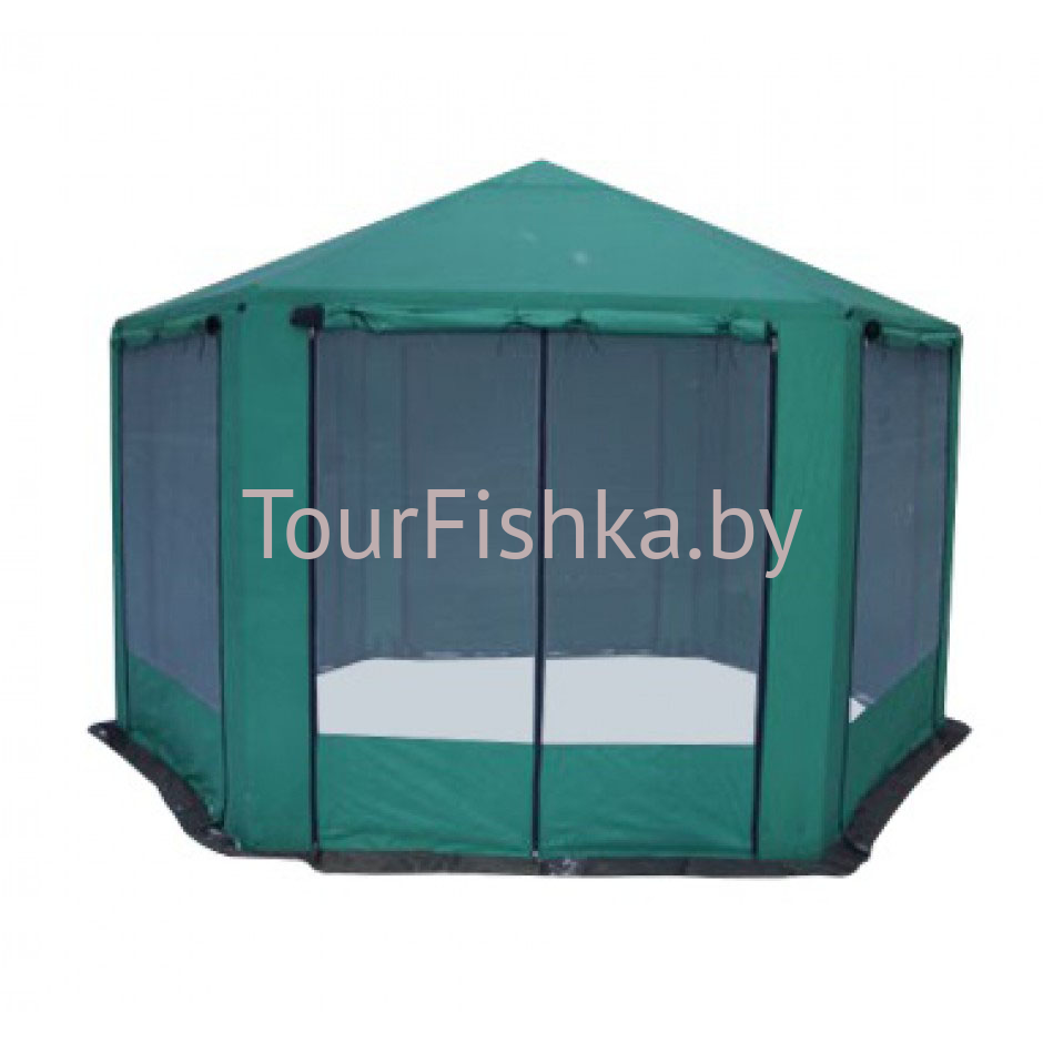 Оригинальный шатер с шестискатной крышей можно использовать как летнее кафе, дачную беседку или павильон для торговли. Стальной каркас шатра имеет нижнее основание, все его части надежно крепятся между собой. Крестовины сделаны из утолщенной трубы, что позволяет повысить устойчивость конструкции.Стропы и липучки помогают хорошо натянуть тент.  что позволяет сделать его частично или полностью закрытым.