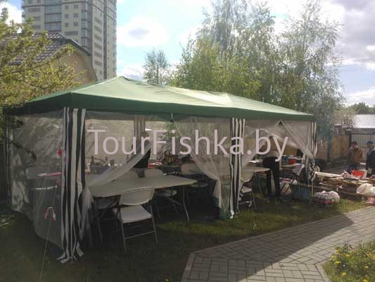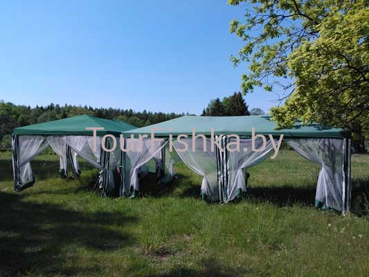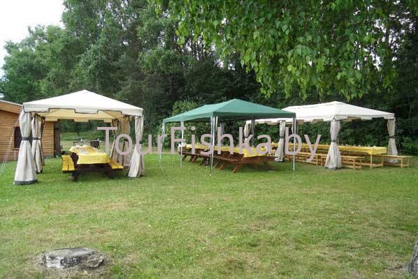 Шатер идеально подходит для застолий на природе, семейного отдыха, приготовления пищи. На его 18-ти квадратных метрах размещается отличная столовая.