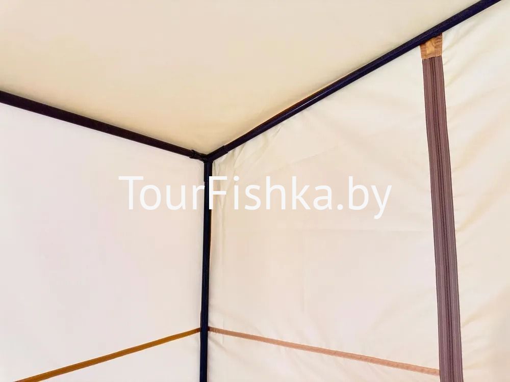 На задней части тента имеется вход на 2 молниях. Крепление тента к каркасу осуществляется с помощью завязок.