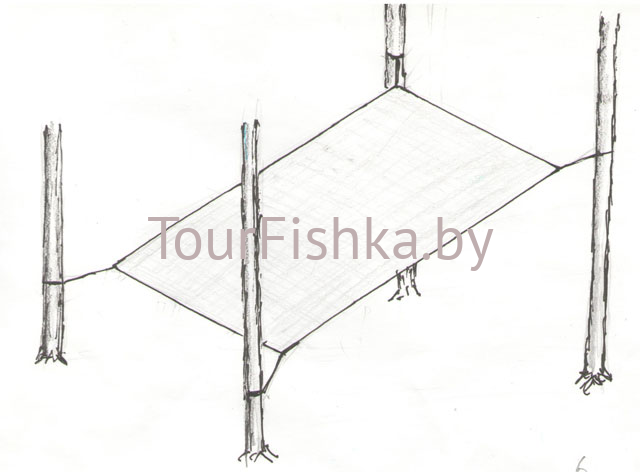 1) Меж двух деревьев вешается веревка, на нее кидается тент, края немного опускаются вниз, получается "двухскатная крыша". Получается, что нужна центральная веревка и еще 4-6 отрезка, чтобы привязывать к основаниям деревьев.