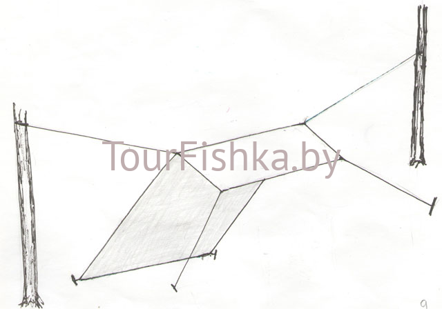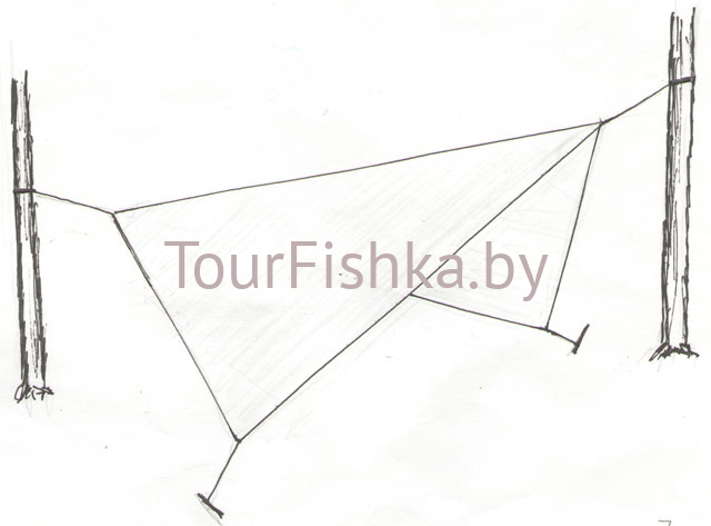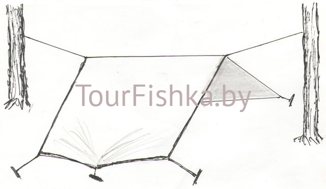 3) Буквой "Г", где одна стенка тента идет до земли, перпендикулярно ей, а другая, как крыша над головой. Тоже центральная веревка и 4-6 отрезка