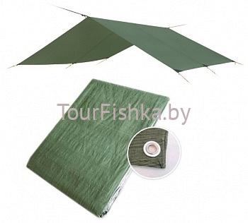 Тент водостойкий защитный для укрытия людей, автомобилей, дров, механизмов от воздействия окружающей среды ― дождя, солнца, ветра. По краю пропущен усиливающий капроновый шпагат и установлены металлические кольца-люверсы.