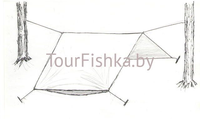 3) Буквой "Г", где одна стенка тента идет до земли, перпендикулярно ей, а другая, как крыша над головой. Тоже центральная веревка и 4-6 отрезка